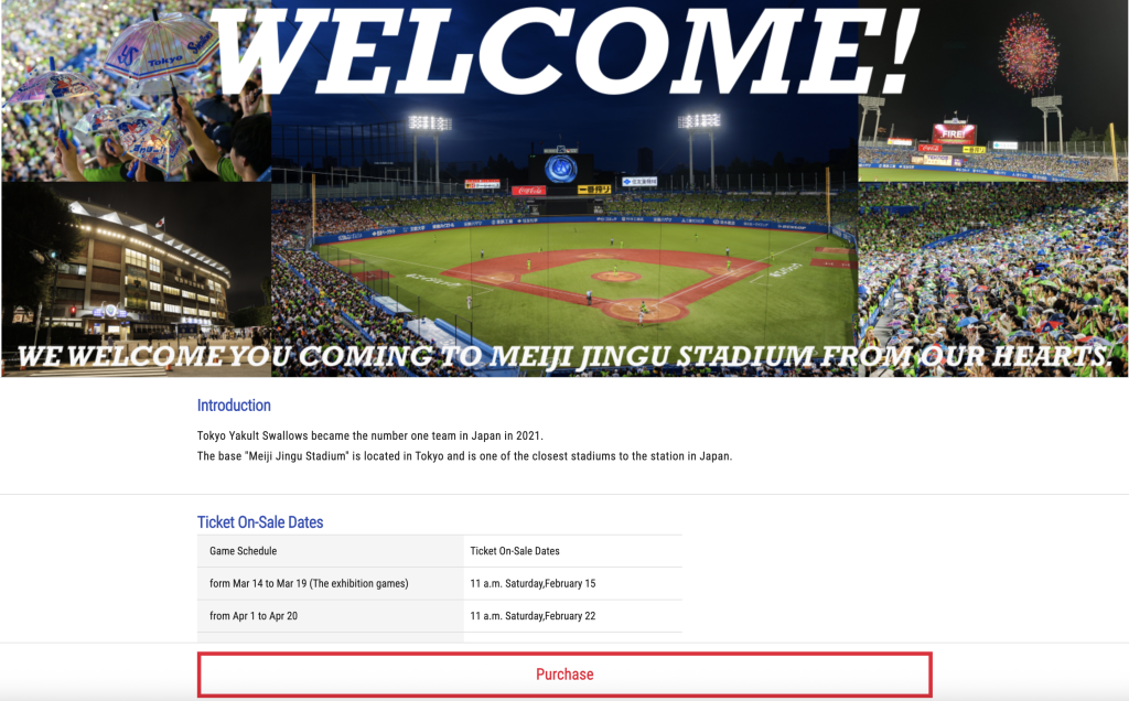 The Yakult Swallows have made it incredibly easy to buy tickets before going to Japan. All you need to do is head to the English Yakult Swallows website and hit the red Purchase button at the bottom of the screen.