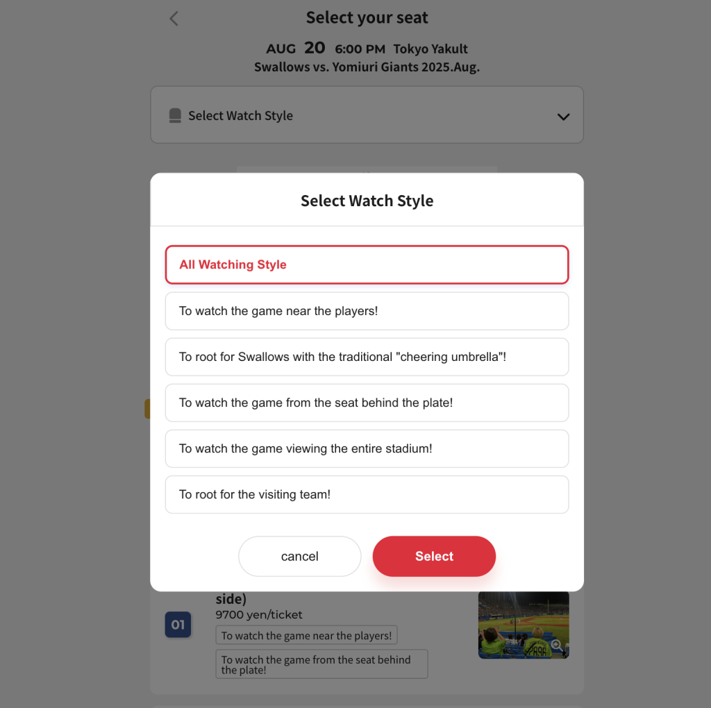On the next screen, you’ll be able to choose which game or games you are interested in attending. The Yakult Swallows tickets site will only list games being played at home.